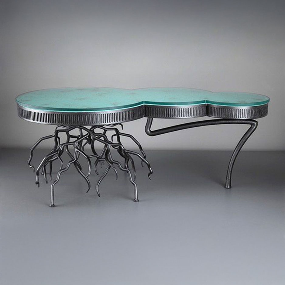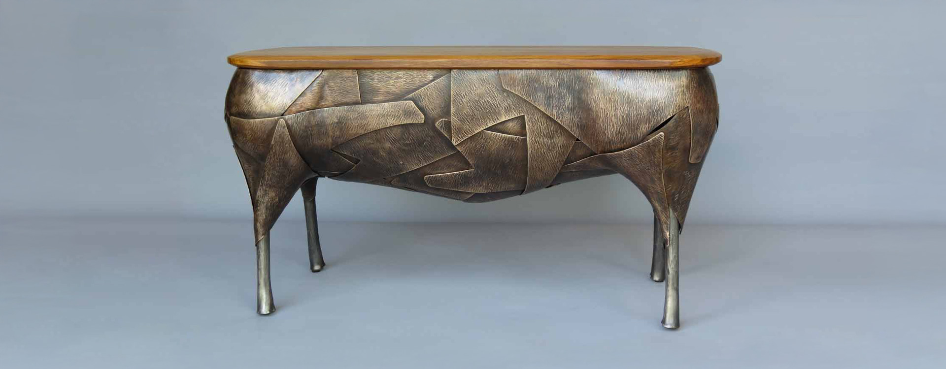 John J. Rais designs and creates one of a kind furniture, sculpture, and architectural metal art. His unique style blending traditional techniques with modern design applications has found a natural home in private residences as well as public museums and universities.