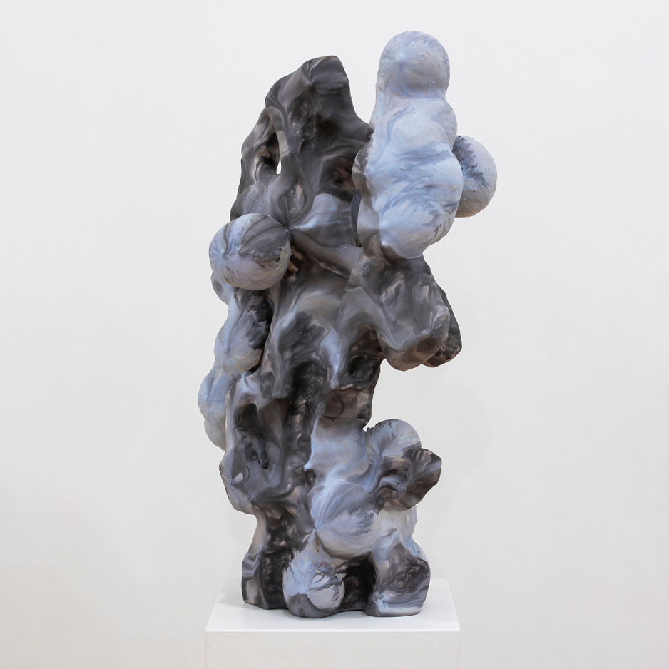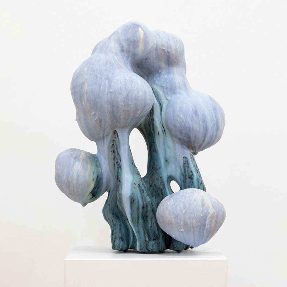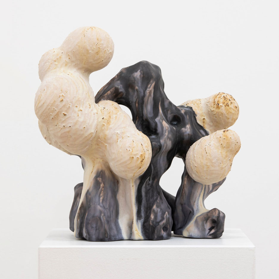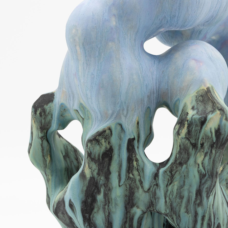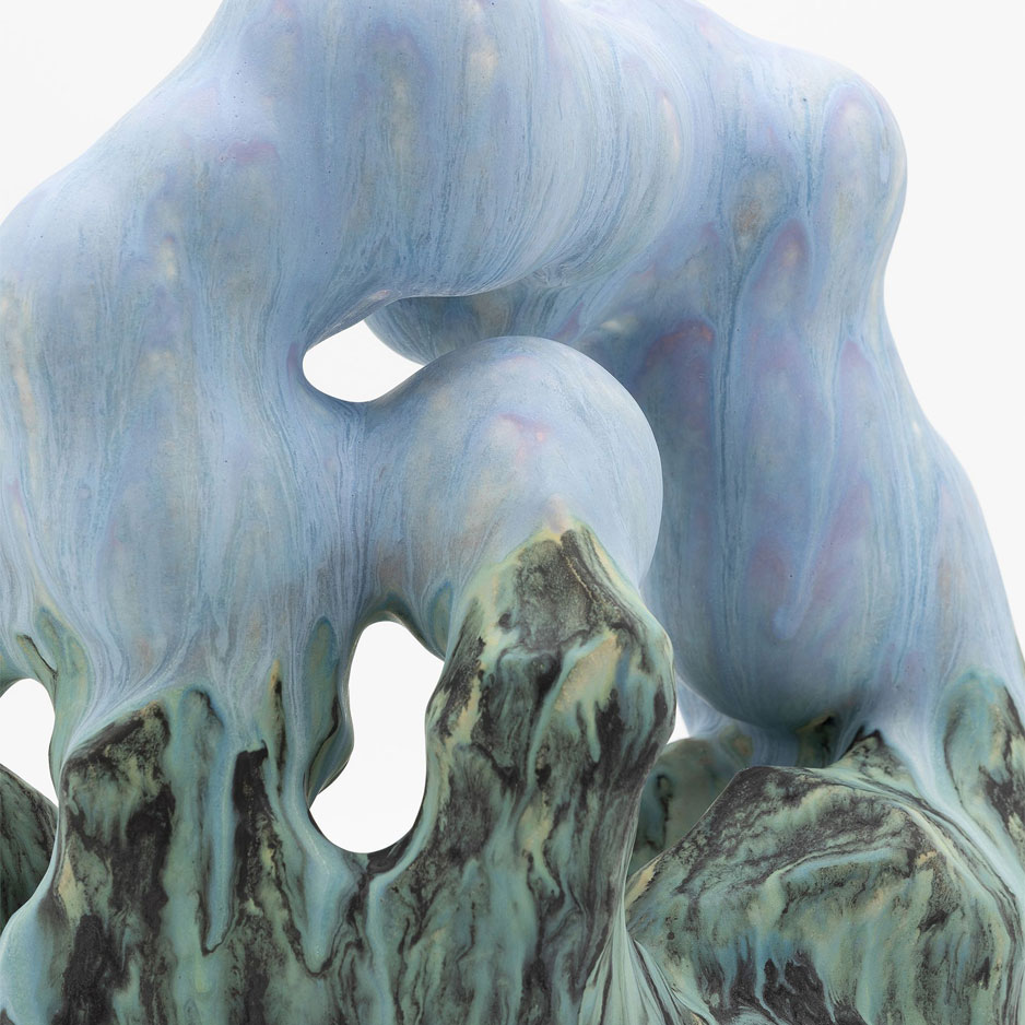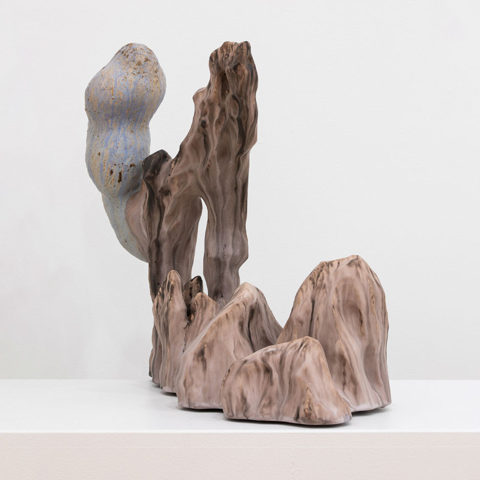Jing Huang’s work is composed of multiple layers of ceramic materials and possibilities, suspended and fired on stilts, flowing down and pooling naturally in response to the topography and gravity. She hand-builds her sculptures part by part and assembles them together to achieve an unknown structure and landscape. During this experimental and highly unpredictable process of making, firing, and installing, the position of her work shifts and changes, becoming a new work of art. The work then becomes ambiguous in nature – it is neither the picture of her hometown nor the view of where she lives currently.