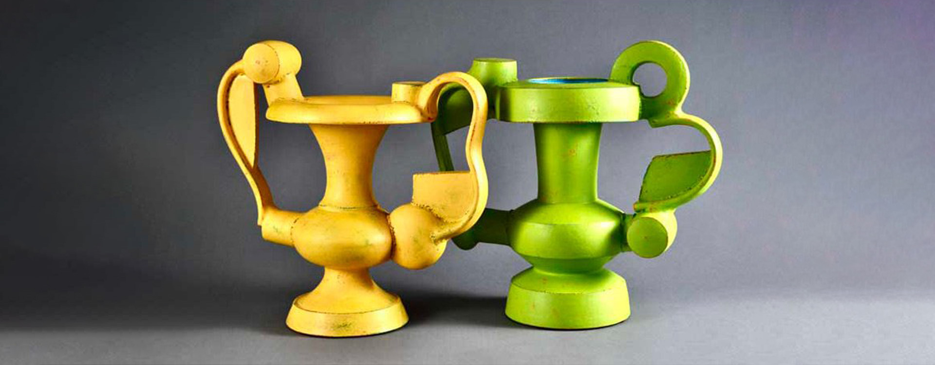 With “Chroma-Structure”, Herren offers bold, non-apologetic monuments to classical forms and functional objects. Tables, amphora urns, stirrup pots, and elaborate architectural vases are assembled through wheel-thrown and slab-built stoneware components coated with layers of oil-based enamel paints. The saturated vivid colors, often subtly bleeding through from lower layers, accentuate and soften the edges of the architectural ceramic forms. Herren’s keen understanding of color saturation animates the massive stone-like forms. With an architect’s eye, he optically flattens a shape in space, pushing another forward, suspending one plane which resists the pull of another. Doug’s monolithic structures are once imposing, yet after careful examination, reveal dynamic elements of stability.