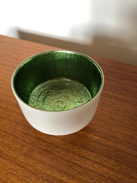 Porcelain, unglazed polished; Footed bowl with blue/green leaf 6" diameter