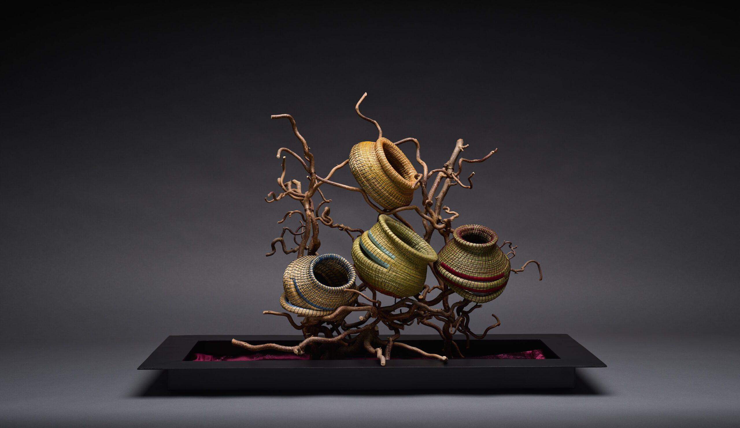 2023 | Sweetgrass, Gourd segments, Silk ribbons, waxed Irish Linen. various semi-precious beads. Branches – Harry Lauder's Walking Stick | Overall Branches: 24" x 25" x 15" Individual Piece Sizes – Blue Left Bottom: 6" x 7" x 6" Top Red: 5.5" x 7" x 7" Bottom Sage: 5.5" x 6" x 7" Yellow: 3.5" x 6" x 7"