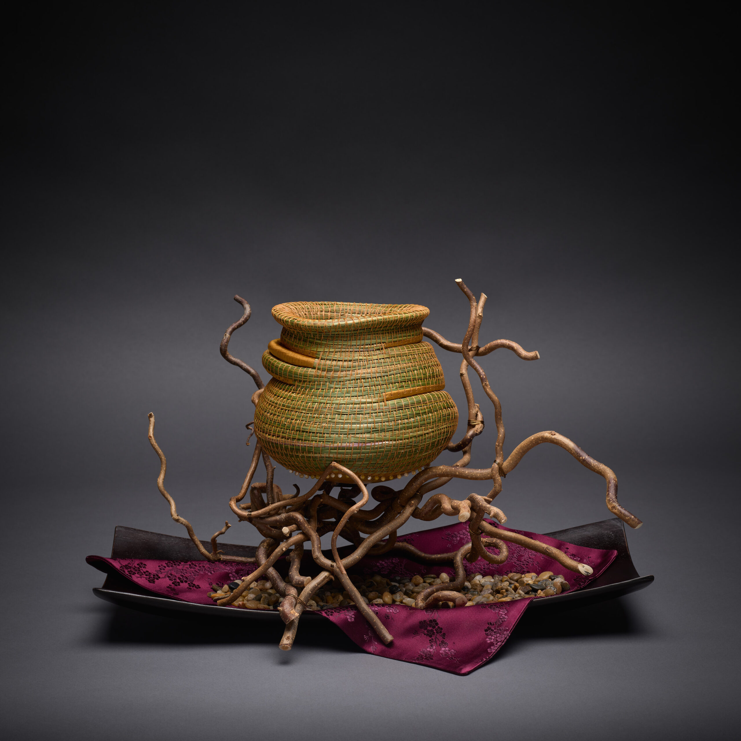 2023 | Sweetgrass, Gourd segment, Silk Ribbon, Mother of Pearl Beads, Branches – Harry Walker's Walking Stick | With Branches – 13.5" x 23" x 16" Without Branches: 7" x 8" x 7.5"