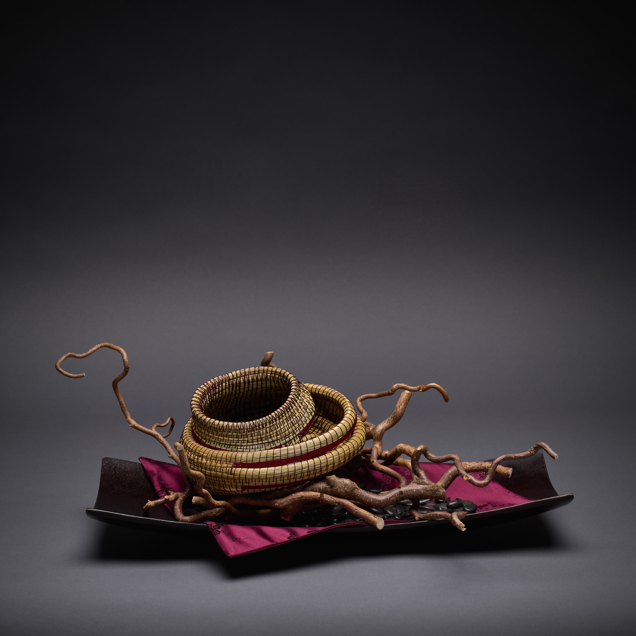 2023 | Sweetgrass, Gourd segment, Silk Ribbon, Waxed Irish linen, Carnelian bead, Branches | 5" H x 7.5" Diameter without branches