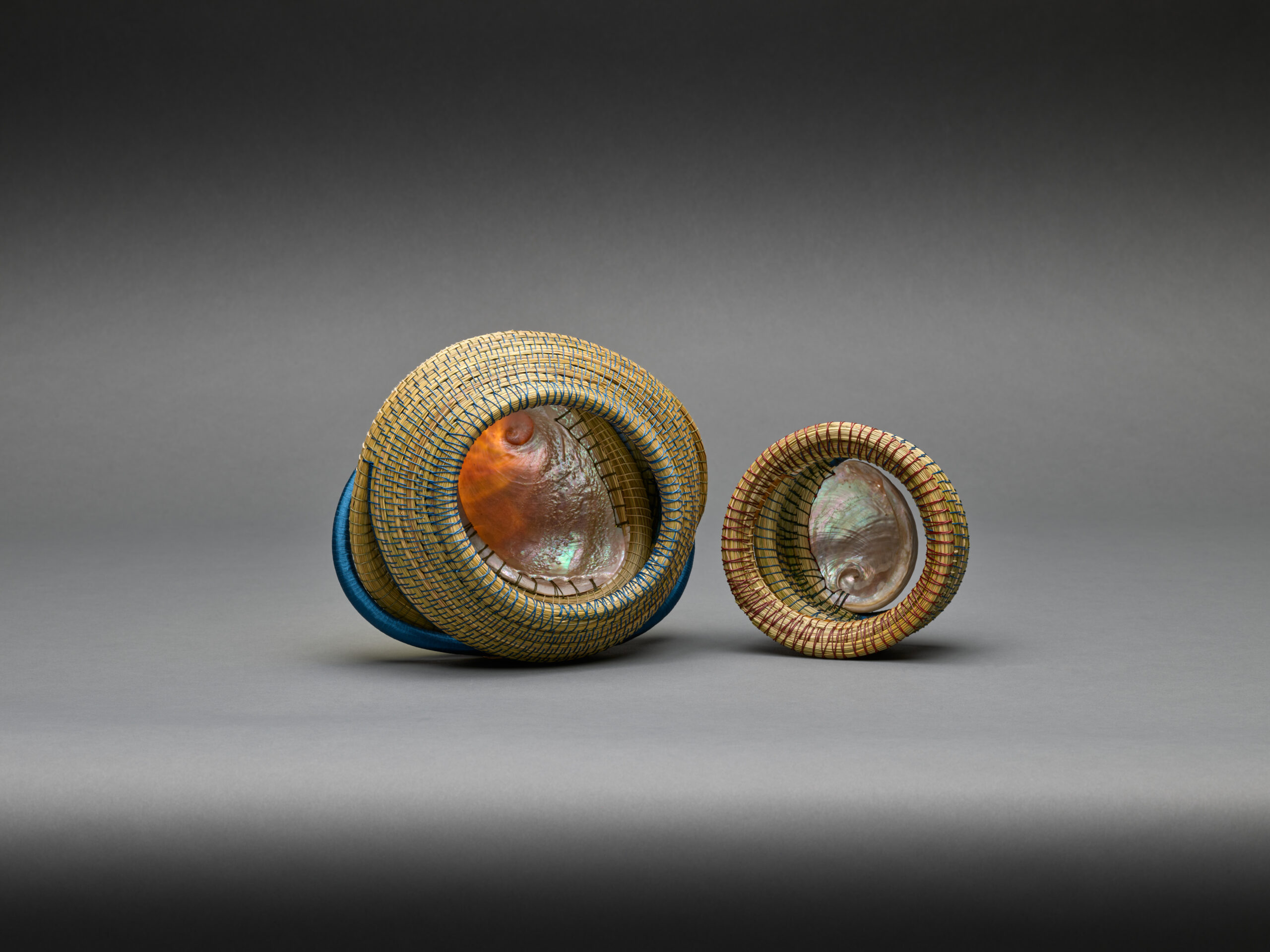 2025 | Sweetgrass, abalone, silk ribbon, waxed irish linen, jade beads | 4" x 6.5" x 6.5"