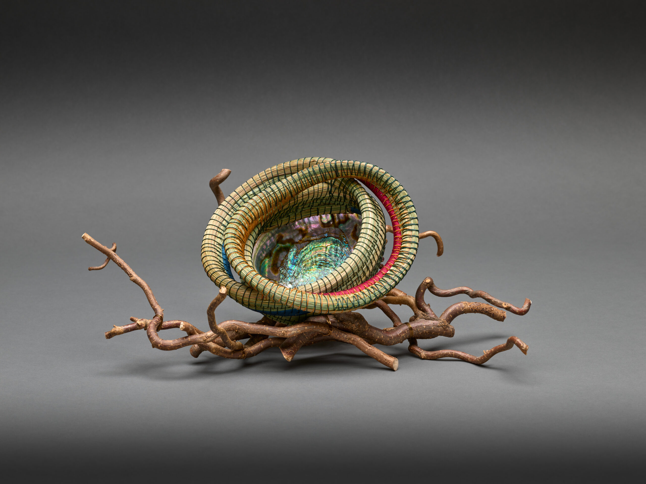 2025 | Sweetgrass, abalone, silk ribbon, waxed irish linen, various beads | 5.5" x 8.5" x 9"