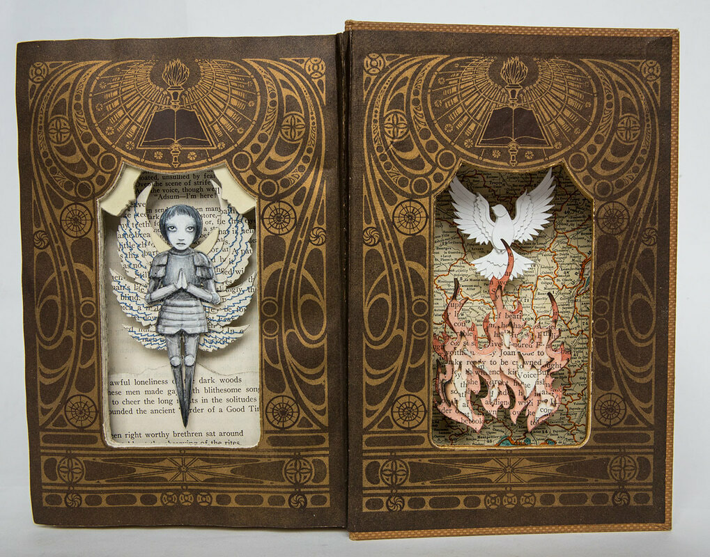 Altered book, thread, paper, acryla gouache, vintage yard stick, anti glare plexiglass