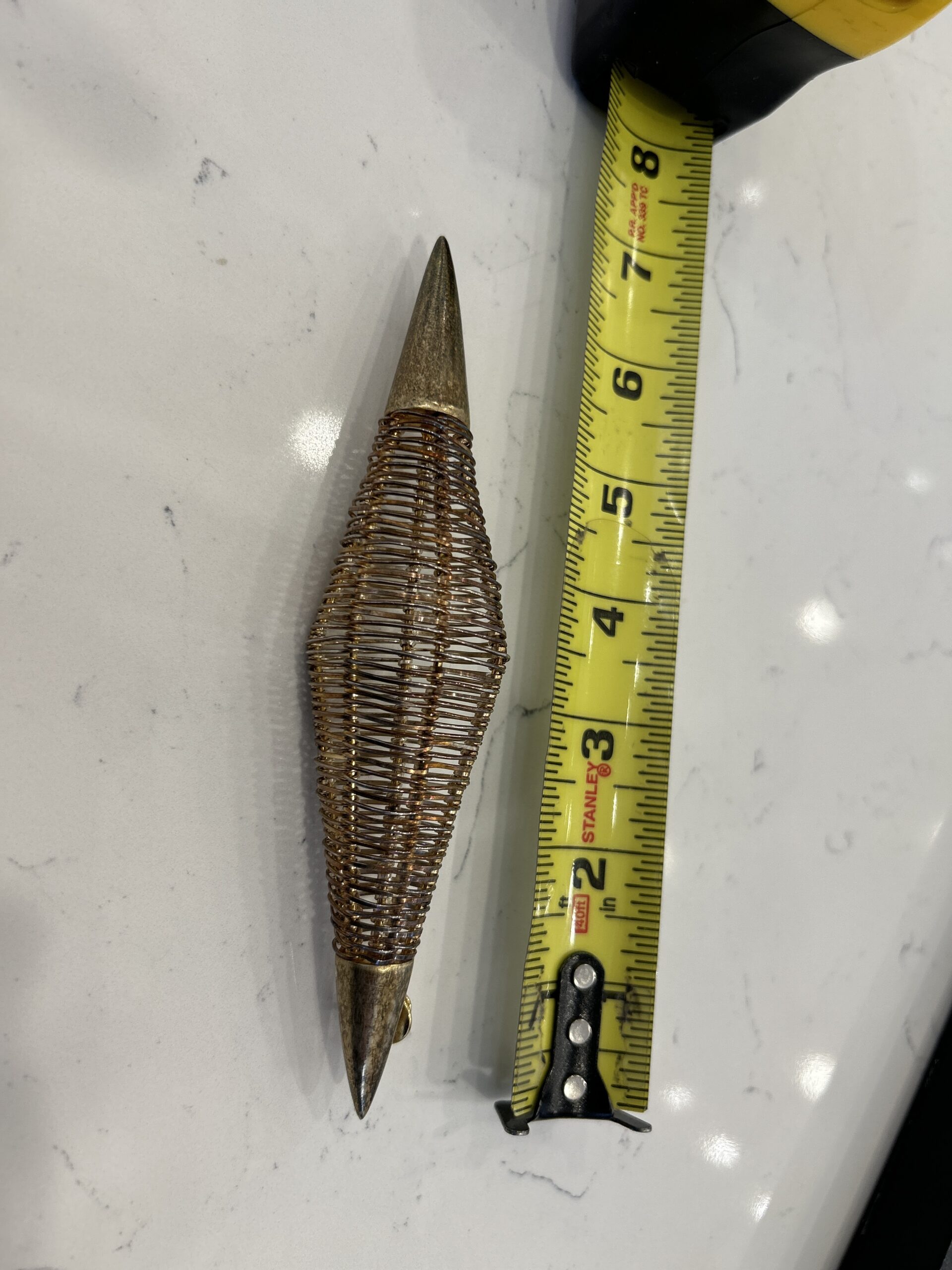 brooch, Bronze copper, brass, gold, 6.5” long double pin back