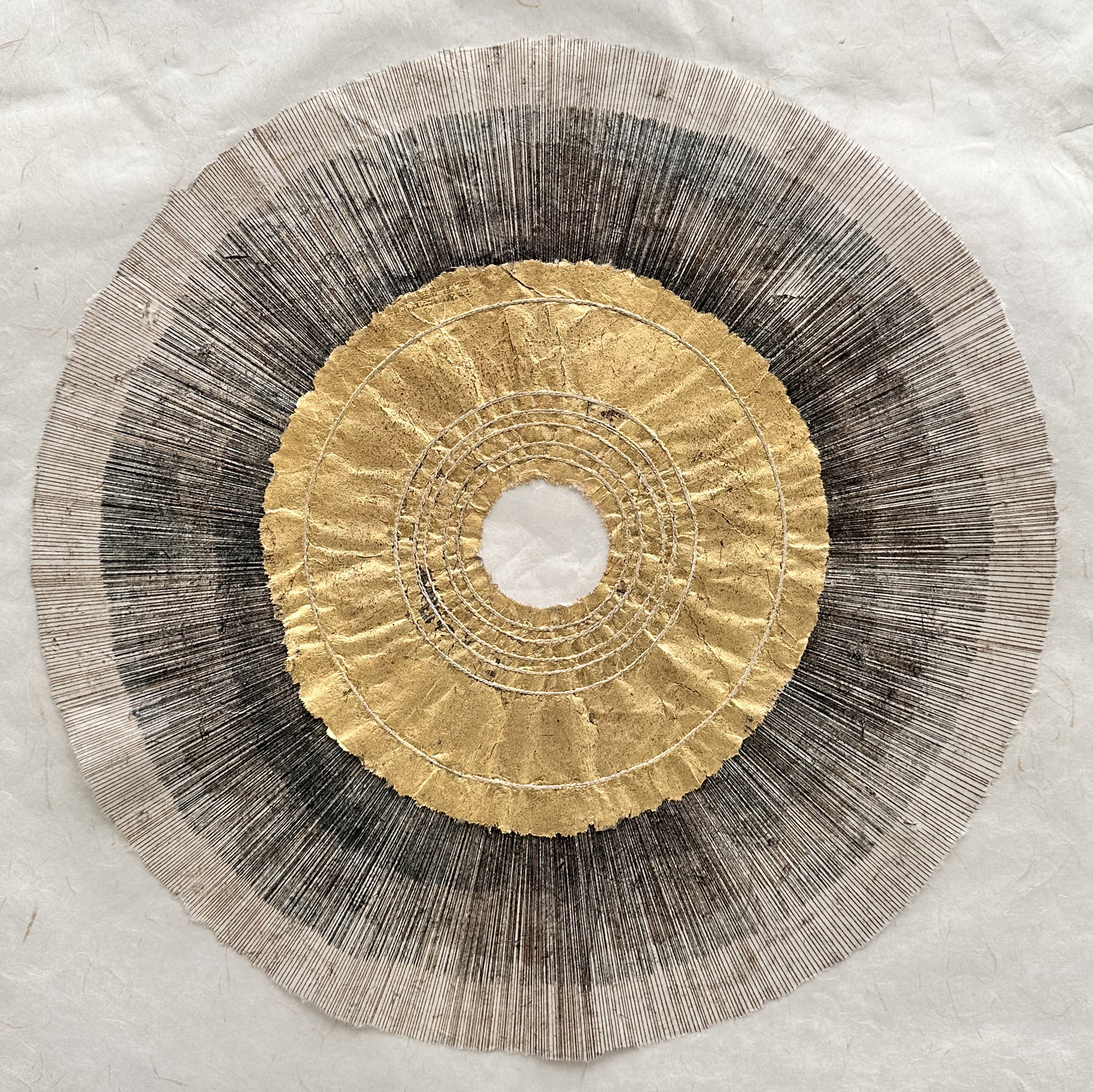 Relief prints onto Burmese mulberry paper, stitching and gold leaf | Framed, 23.25" x 23.25"