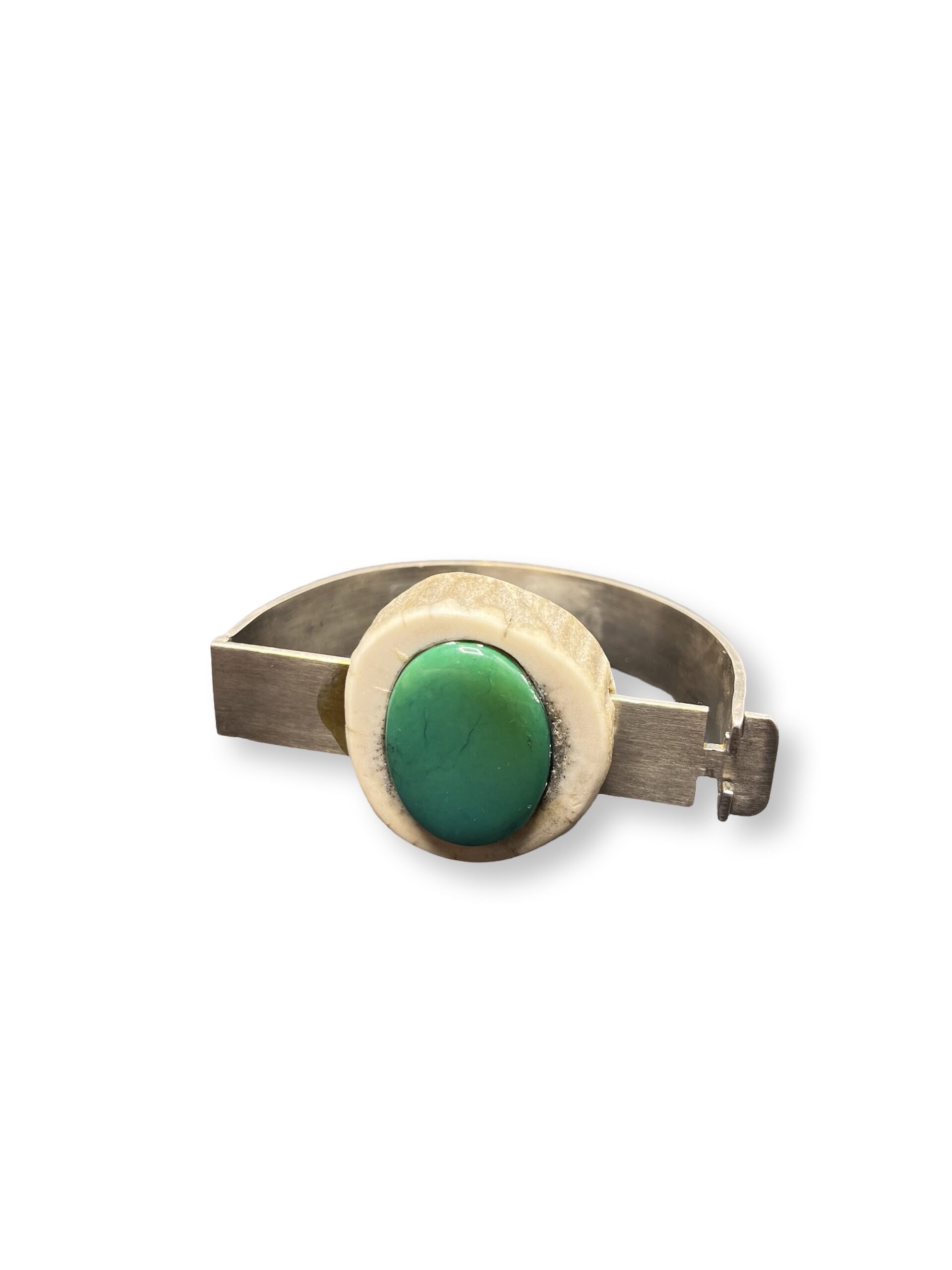 Half moon clasp bracelet silver, bone and large green stone
