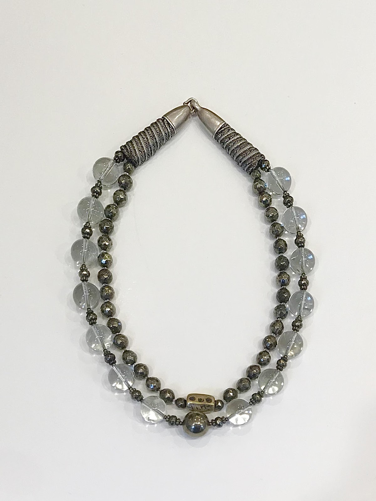 Large Green Amethyst Balls, Faceted and Smooth Pyrite, Silver Caps and Old Hill Tribe Bead, Sterling Clasp