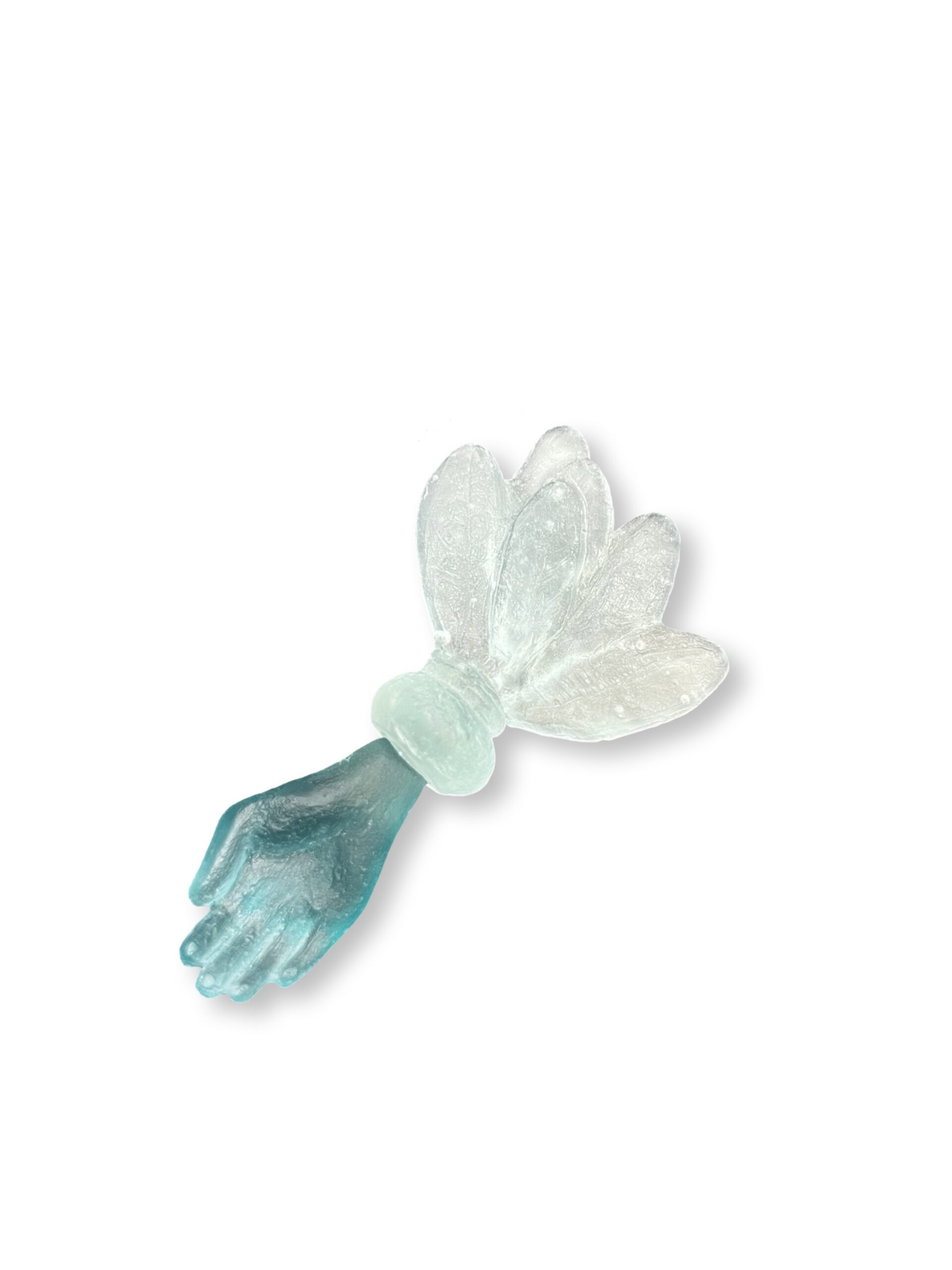 Jade-colored hand w/green leaf form. Cast glass, Pate de verre