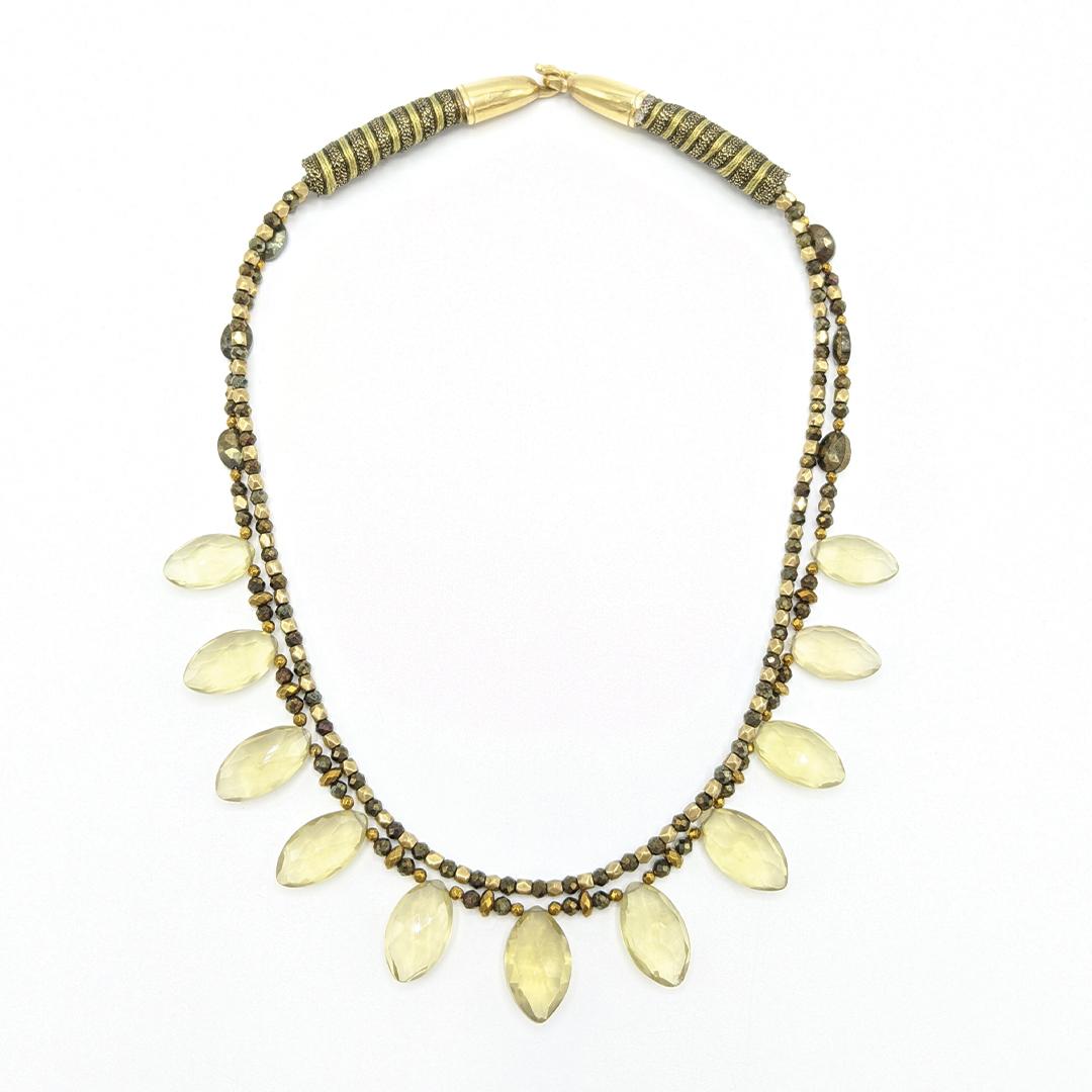 Frida: Lemon Quartz Petals, Faceted Pyrite, Gold Electroplated Pyrite, Ethnic Brass, Bronze Clasp.