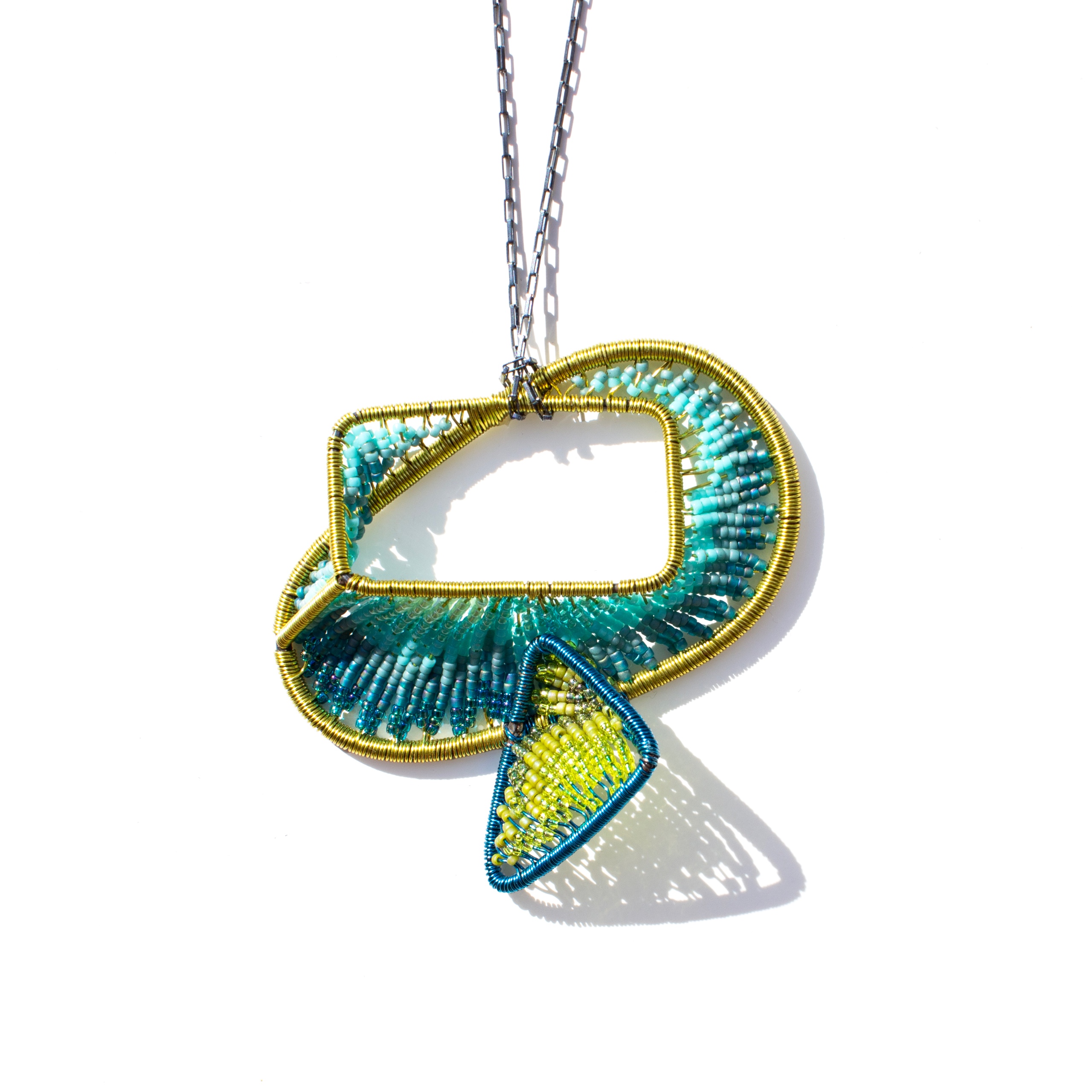 2025 | steel, wire, glass beads, sterling silver chain | 2.75" x 2.375" x 0.75"; 24" chain