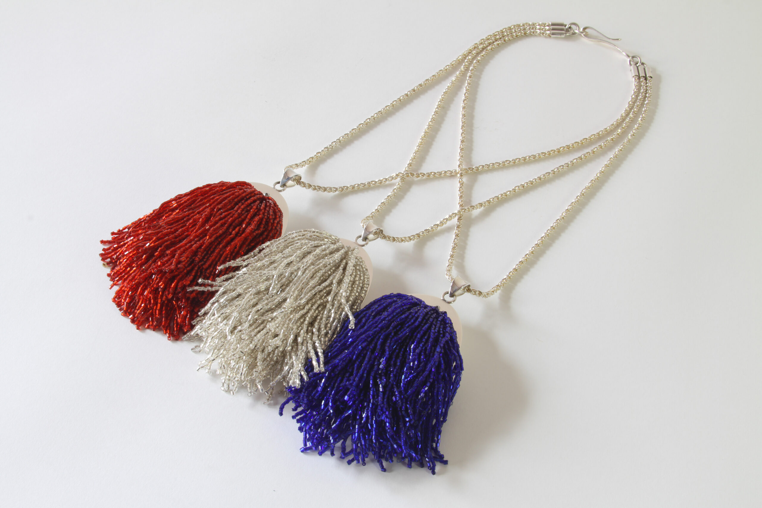 | sewn with needle and glass beads made in China, thread made in Mexico, fabricated with sterling silver responsibly sourced in the USA