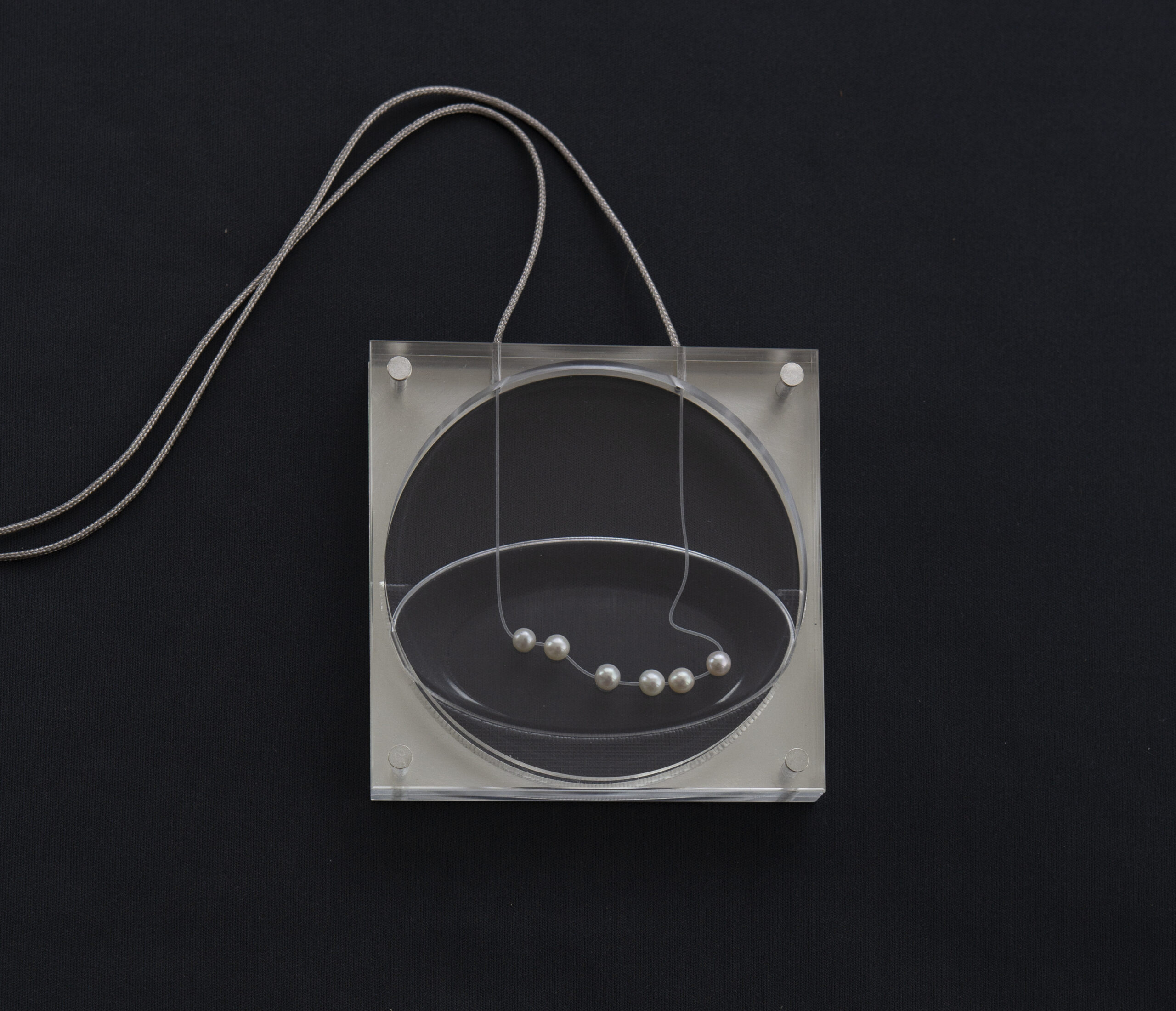 85 x 85 x 15mm | Acrylic, silver plated brass, pearls, nylon cord, silver