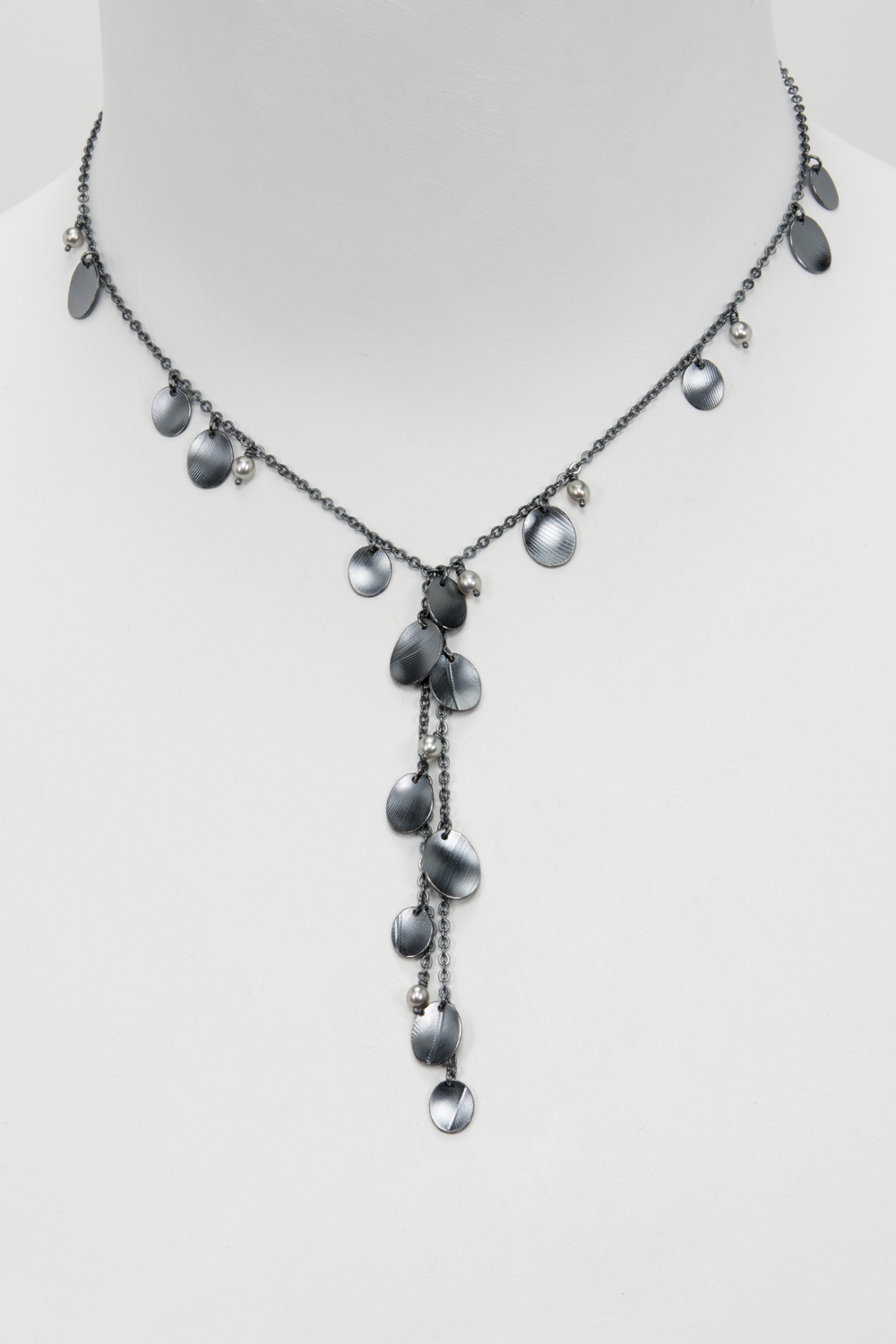 Short Y Feather Print Necklace | Oxidized sterling silver, pearls