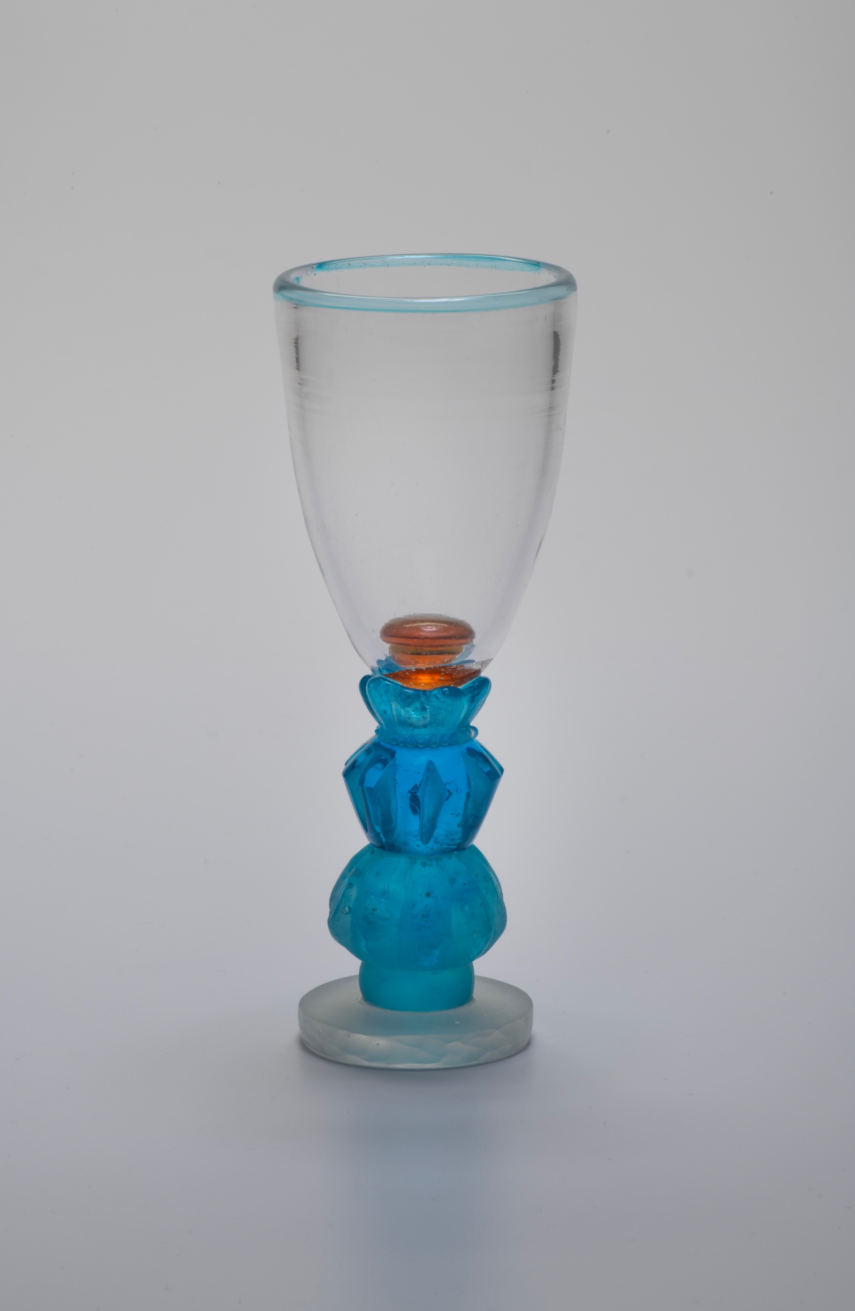 Small blue cordial with aqua jewel and clear disk foot | Anna Boothe