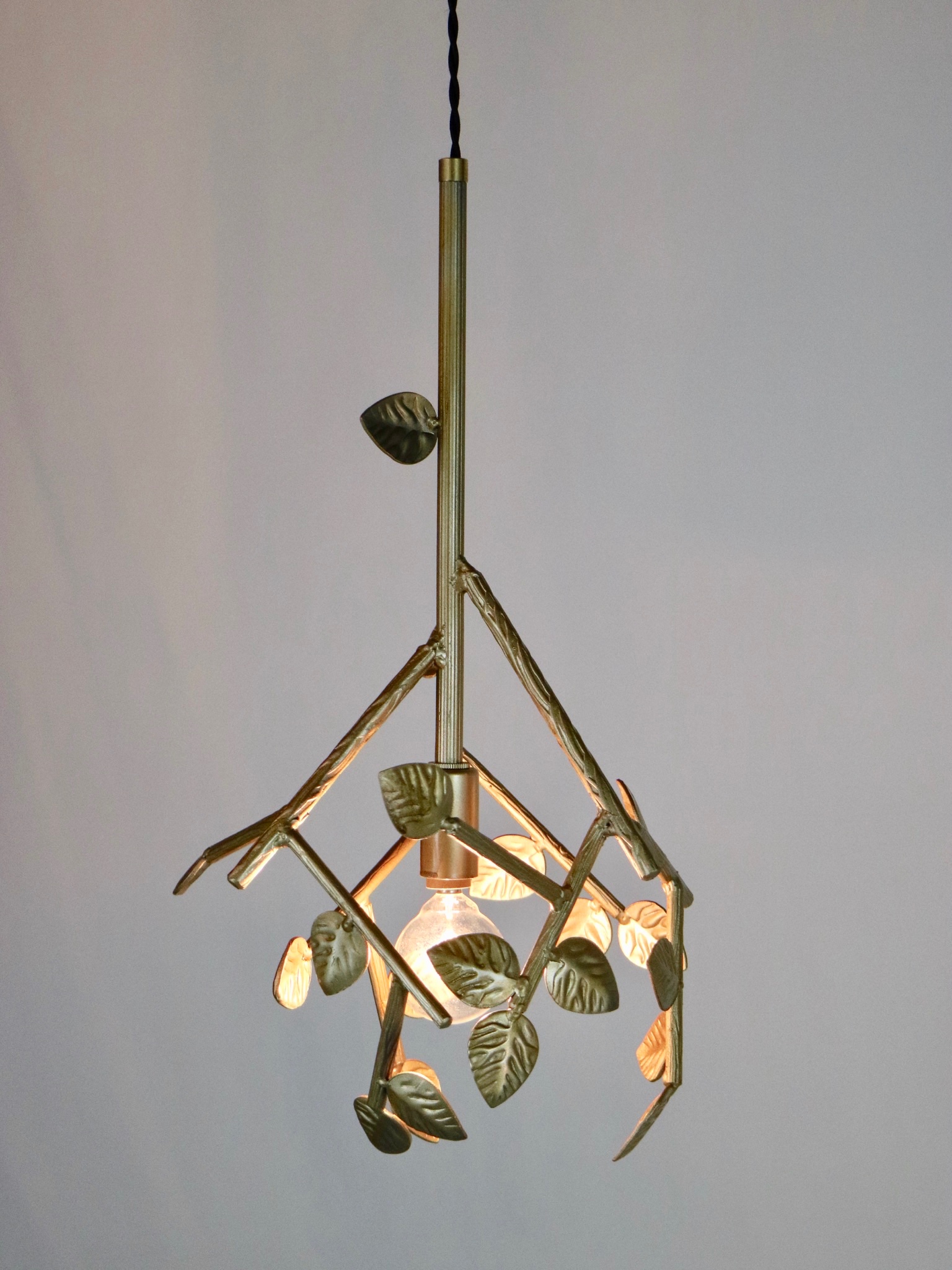 2025 (Designed 2020) | Welded steel with antique bronze paint finish, UL listed for hard wire installation, e12 LED bulb, fabric covered lamp cord | made to order, no two are quite alike | 16" x 9" x 9"