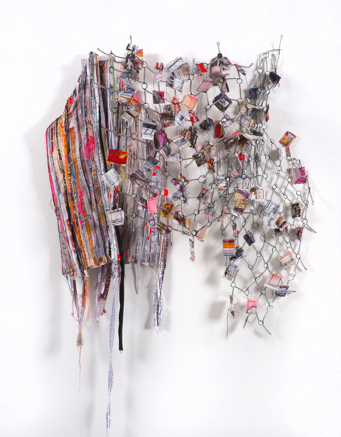 Assorted hand painted/ digitally printed fabrics, ink, dye, gouache, threads, wires, magnets tubing, drawing, painting, digitally created, manipulated & printed images, hand and machine sewing, weaving, golding, stuffing, wrapping, cutting, pinning