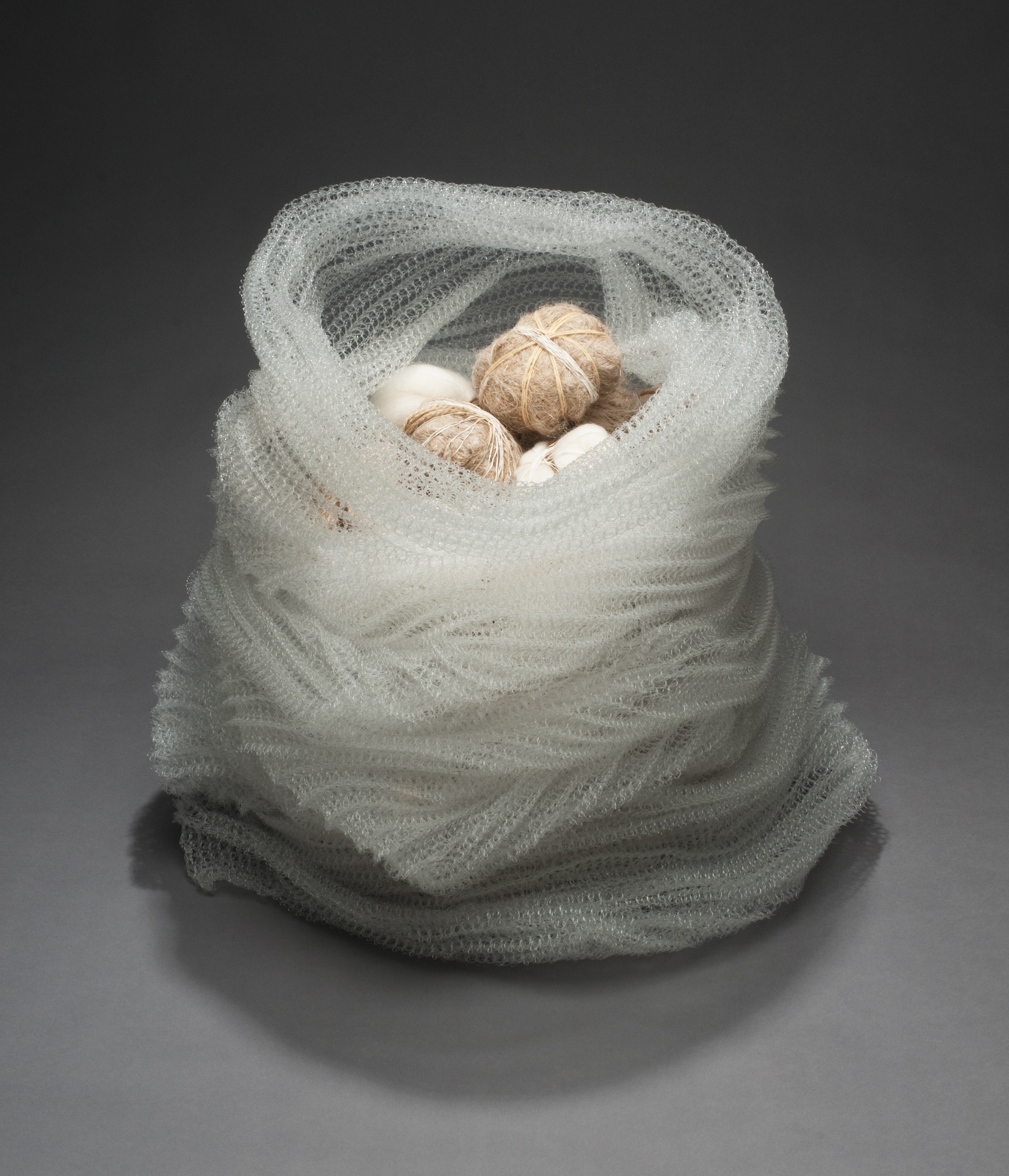 Wrinkled (basket), monofilament, wool roving, linen roving, silk, jute, H.19"xW.17.25"x18.25"